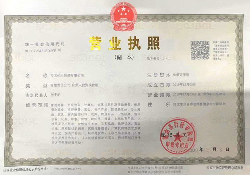 河北燊火贸易有限公司成立于2019-12-03,经营范围包含:家用电器、制冷设备、计算机、计算机软件及辅助设备、信息安全设备、监控设备、五金、电子产品、预包装食品、办公用品、家具、室内装饰材料、花卉、厨房用品、卫生洁具、通讯设备、玩具、钟表、眼镜、纺织品、服装、文化体育用品、化妆品及卫生用品、金银珠宝首饰、工艺礼品、数控机床、农业机械、照相器材的销售;家用电器维修;计算机网络技术及软件开发;国内广告设计、制作与发布;互联网信息服务(不含投资及投资咨询)。